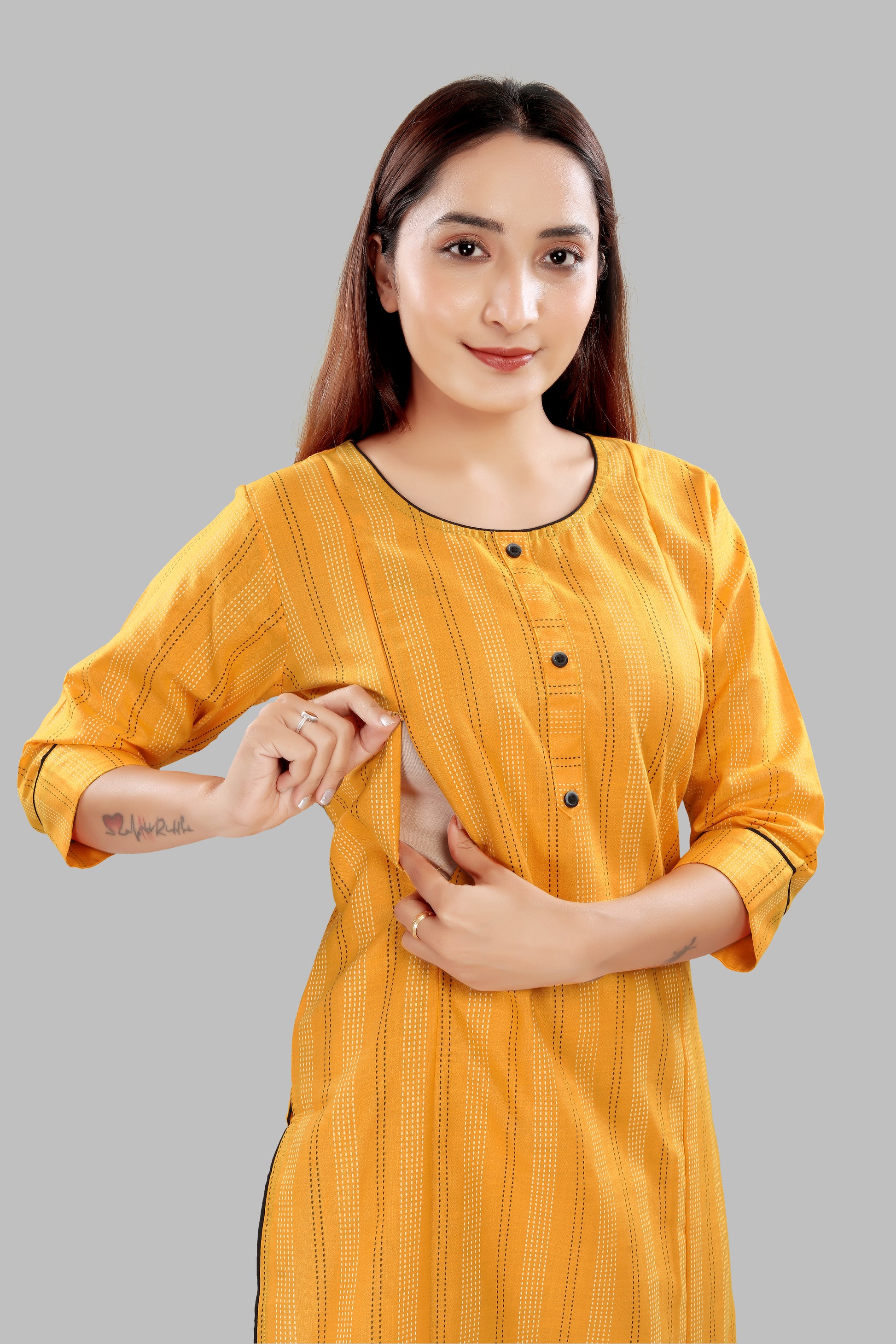 Each kurti has two concealed vertical zippers (approx. 9") on either side of the chest, allowing discreet and convenient nursing access.