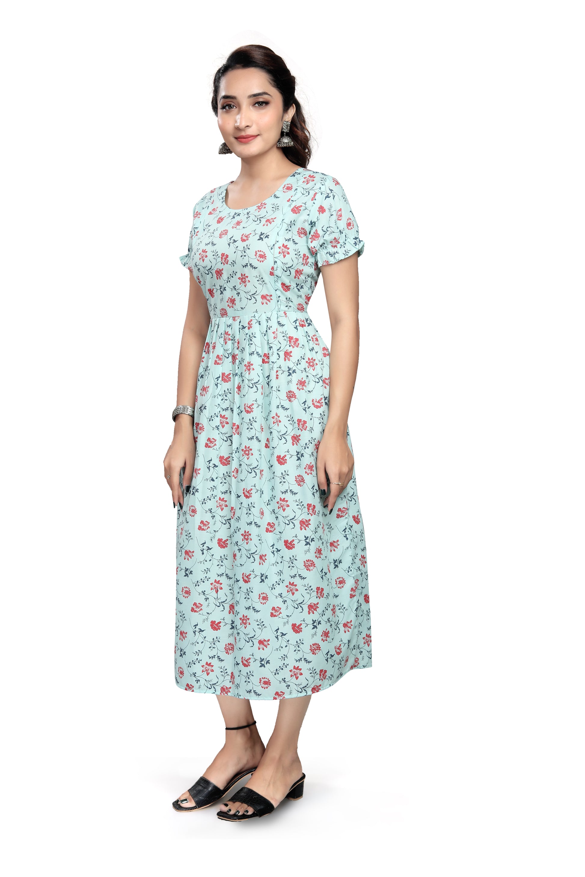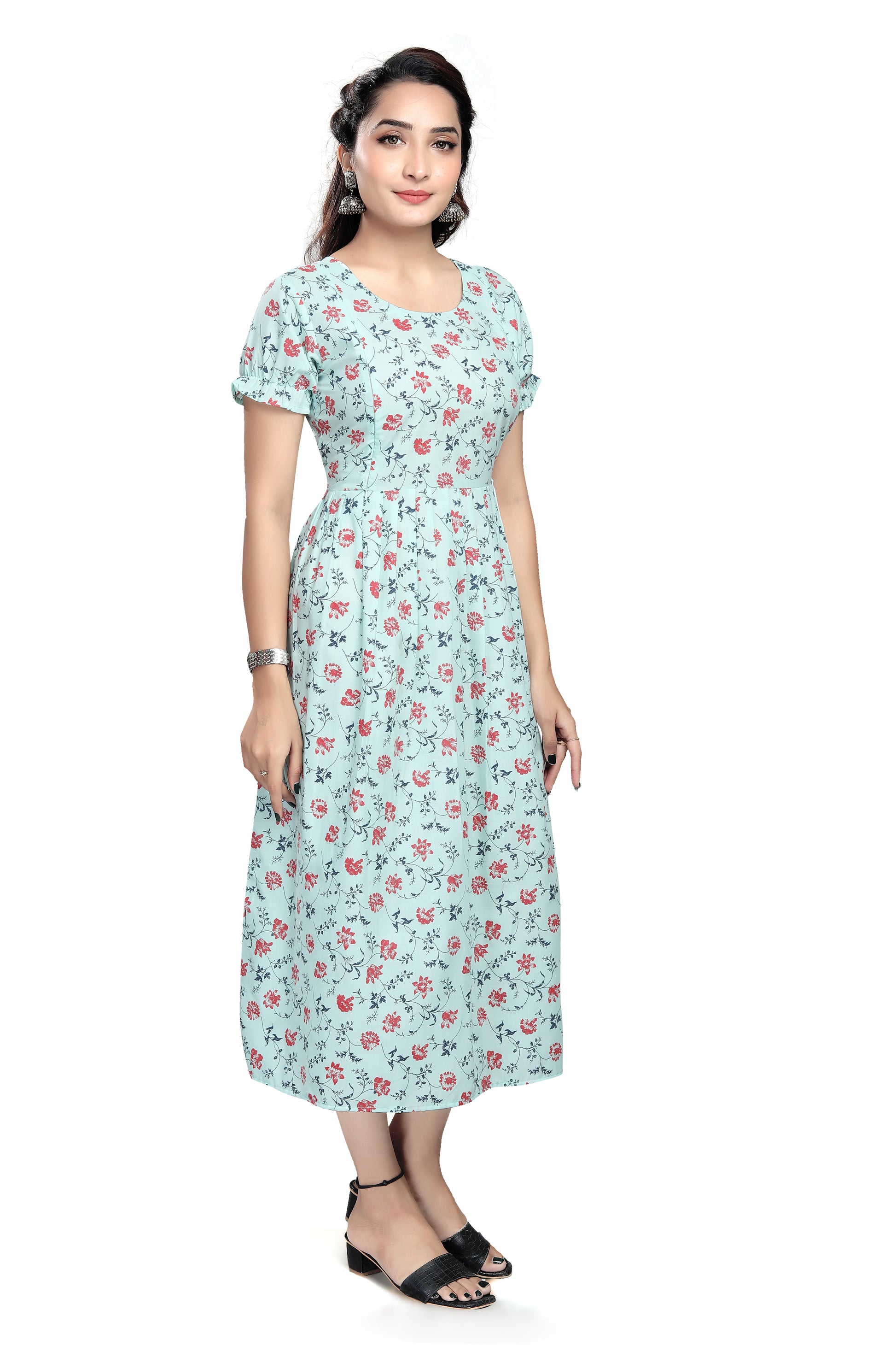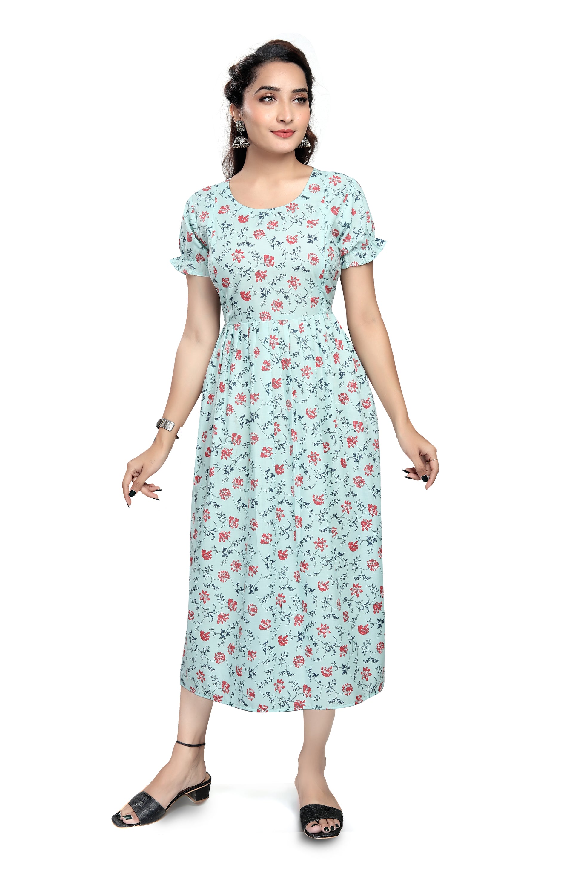 - Ruffled short sleeves and round neckline for a gentle, classic look.
