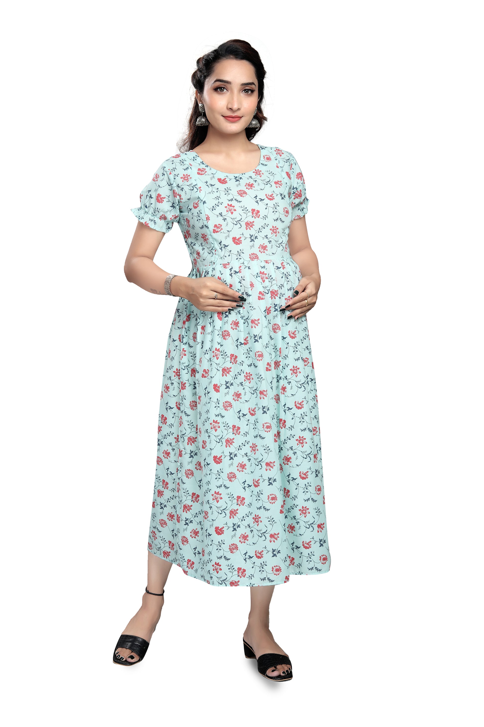 - Pleated waist and flowy skirt provide room for the bump and graceful movement.