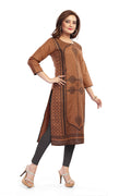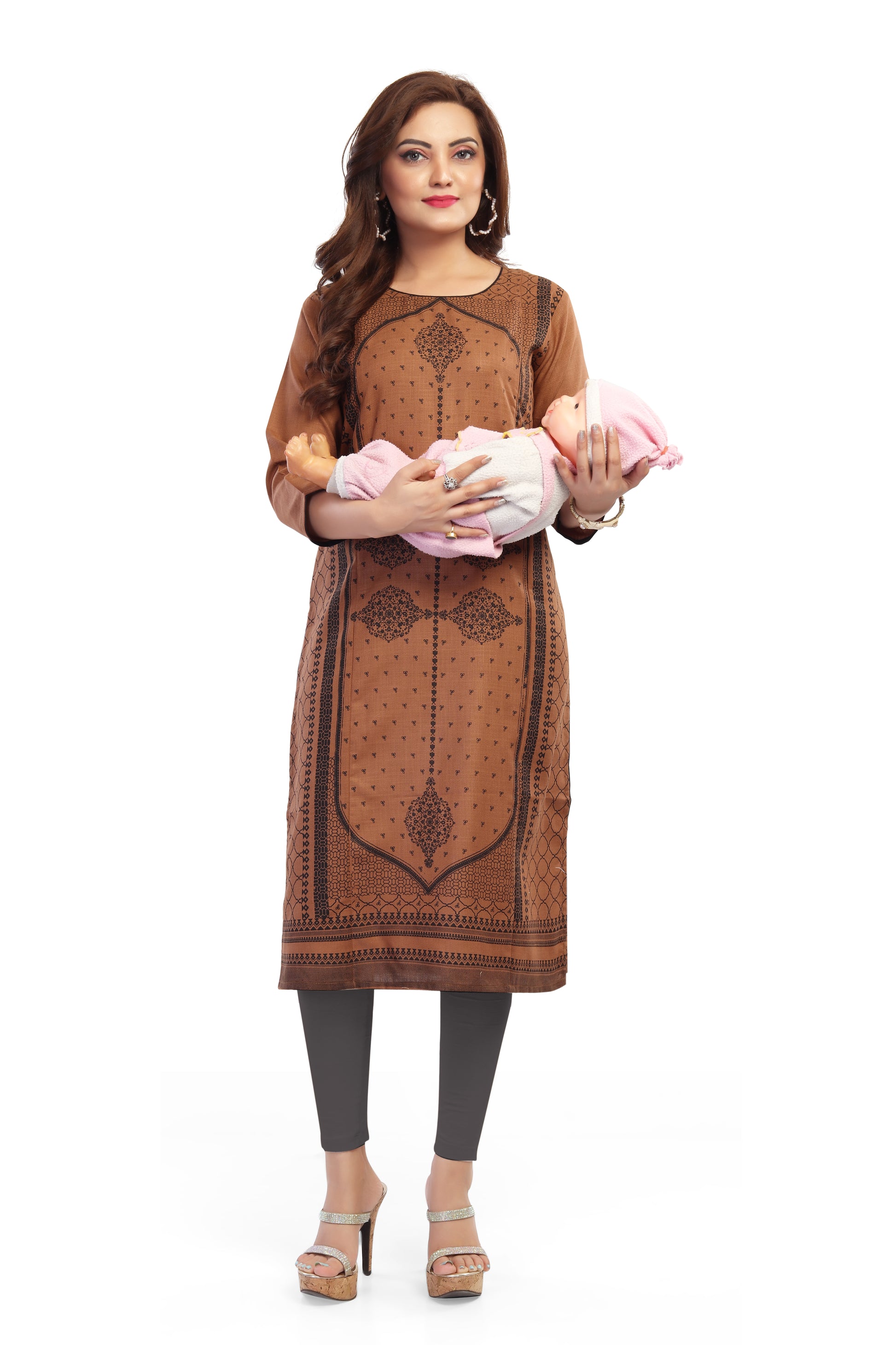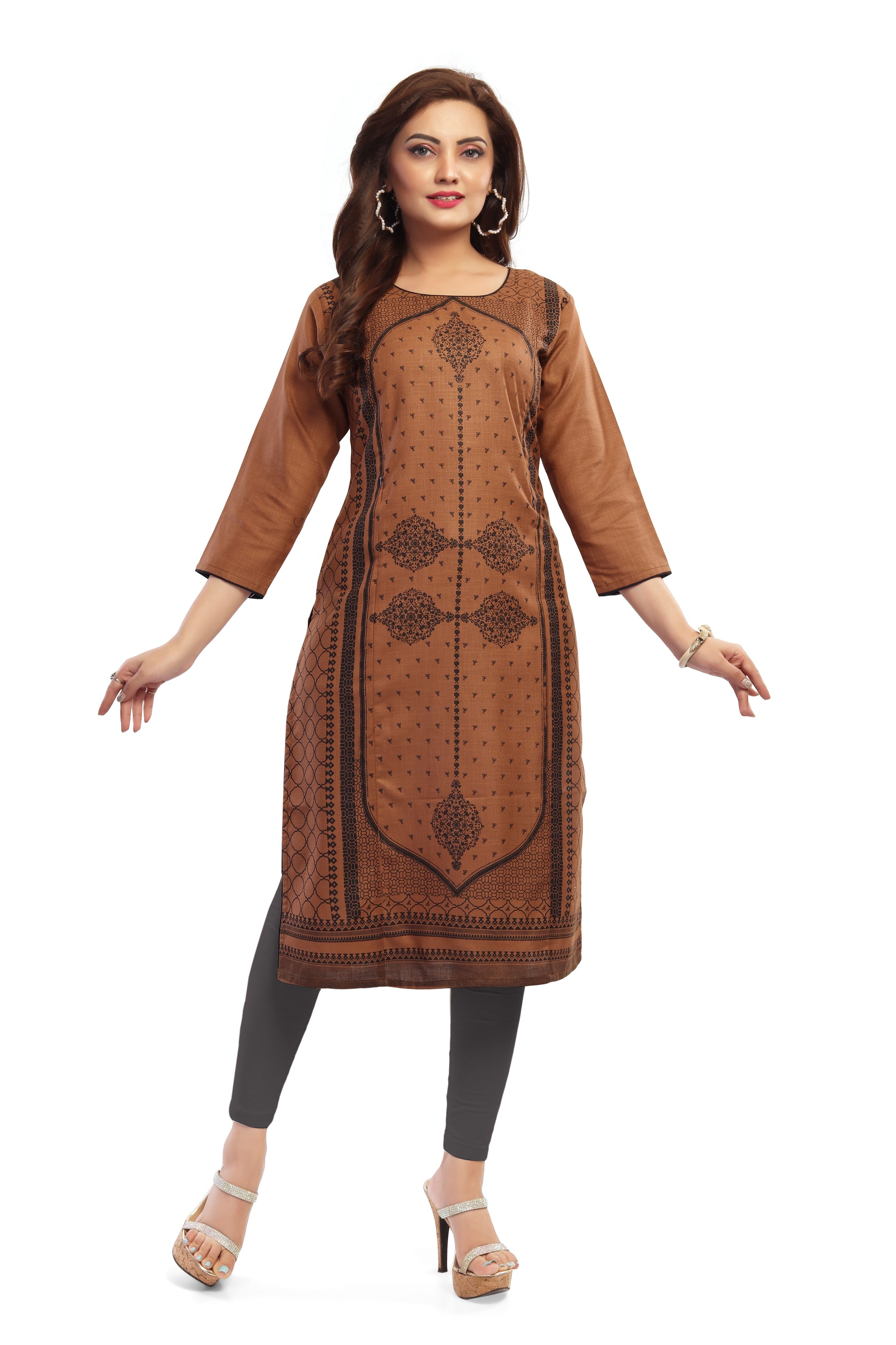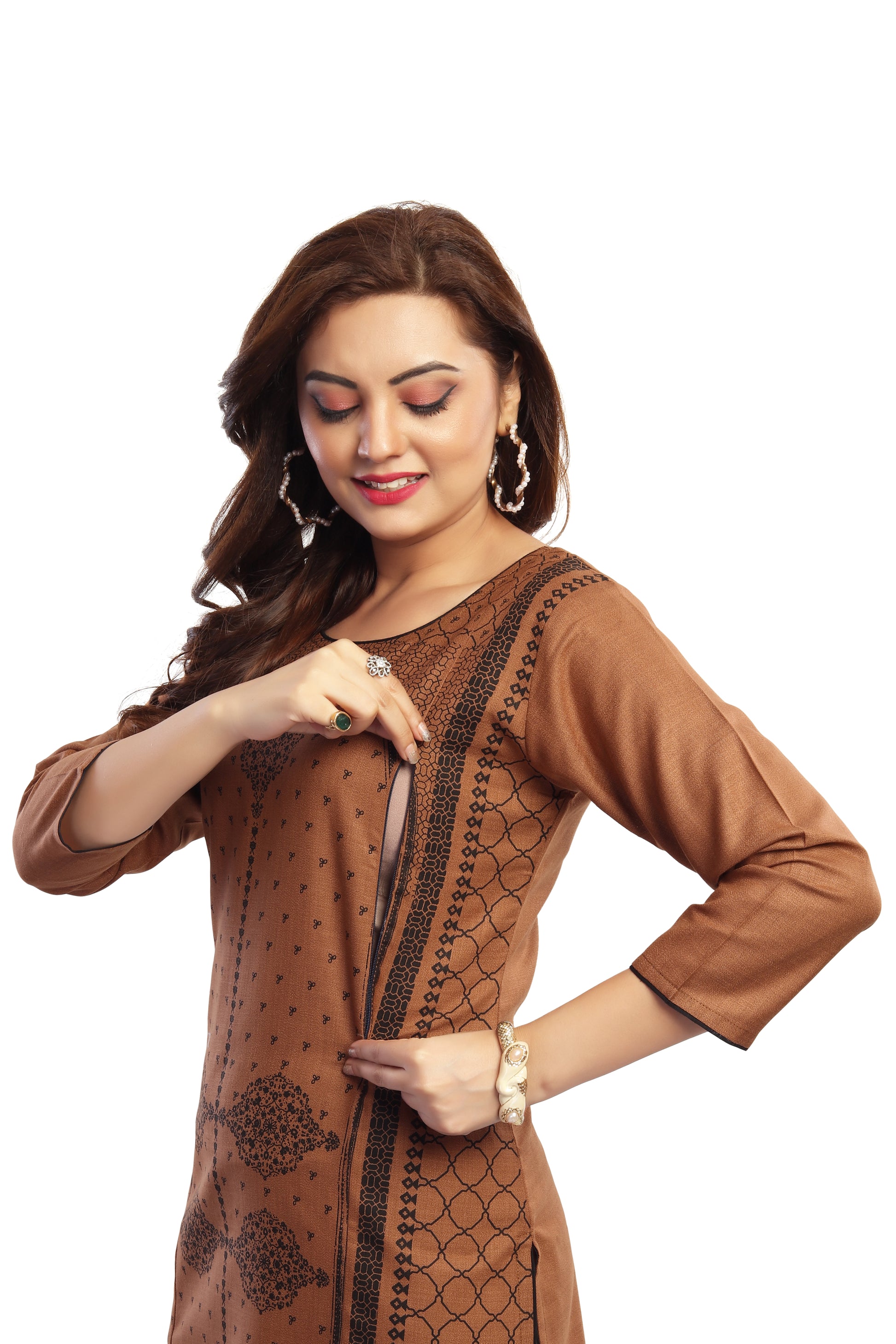 - Warm coffee-brown body with black motif panel and border for an elegant look.