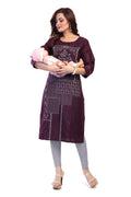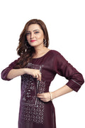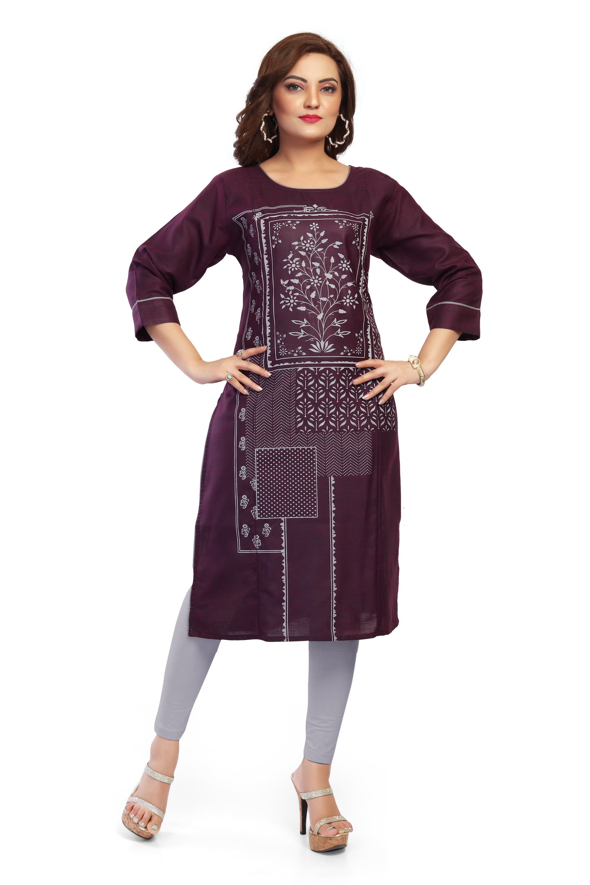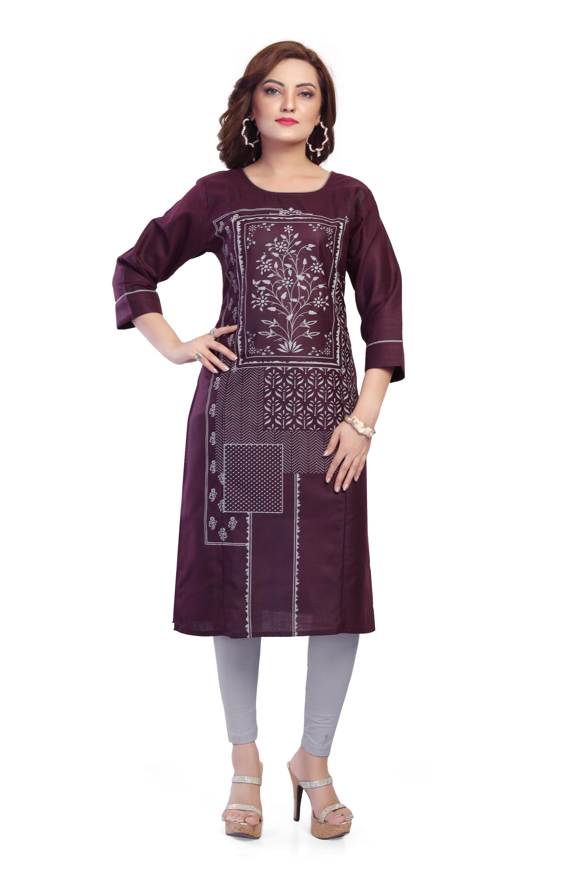 - Elegant wine-purple base with contrast white floral patch print panel.