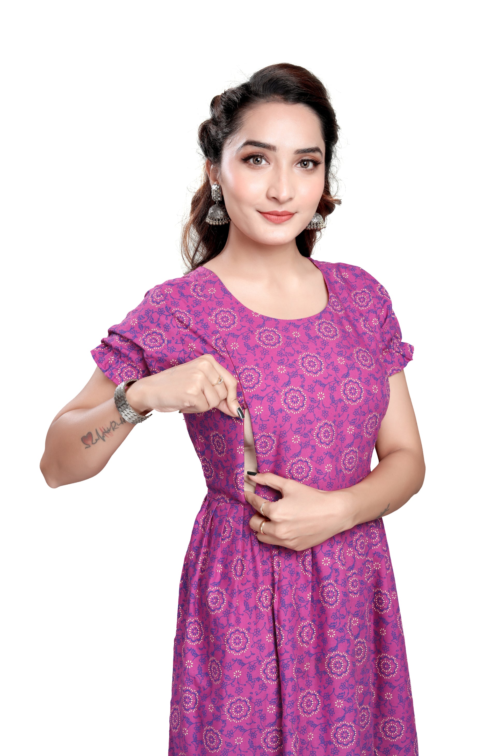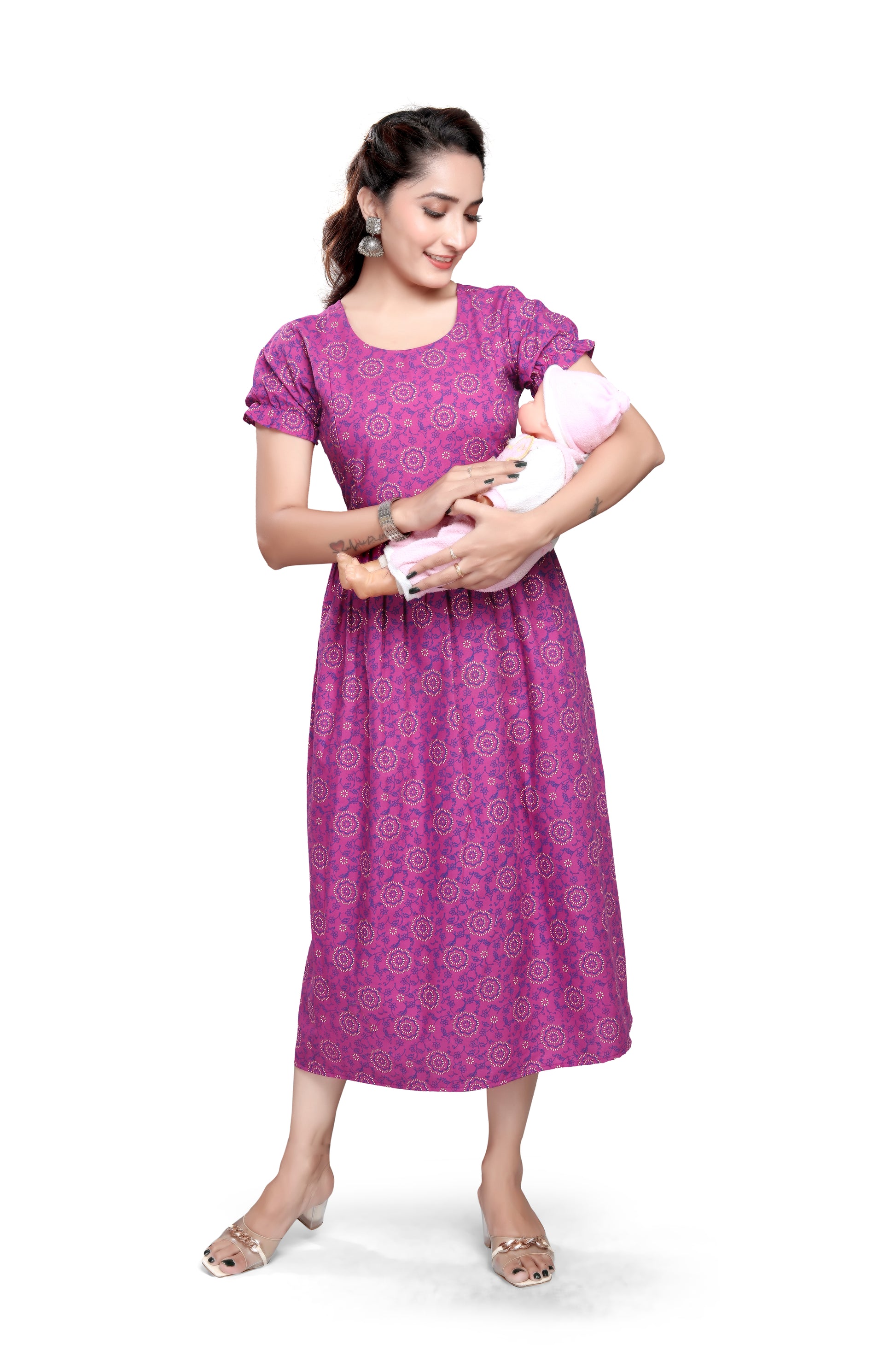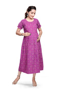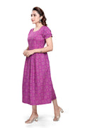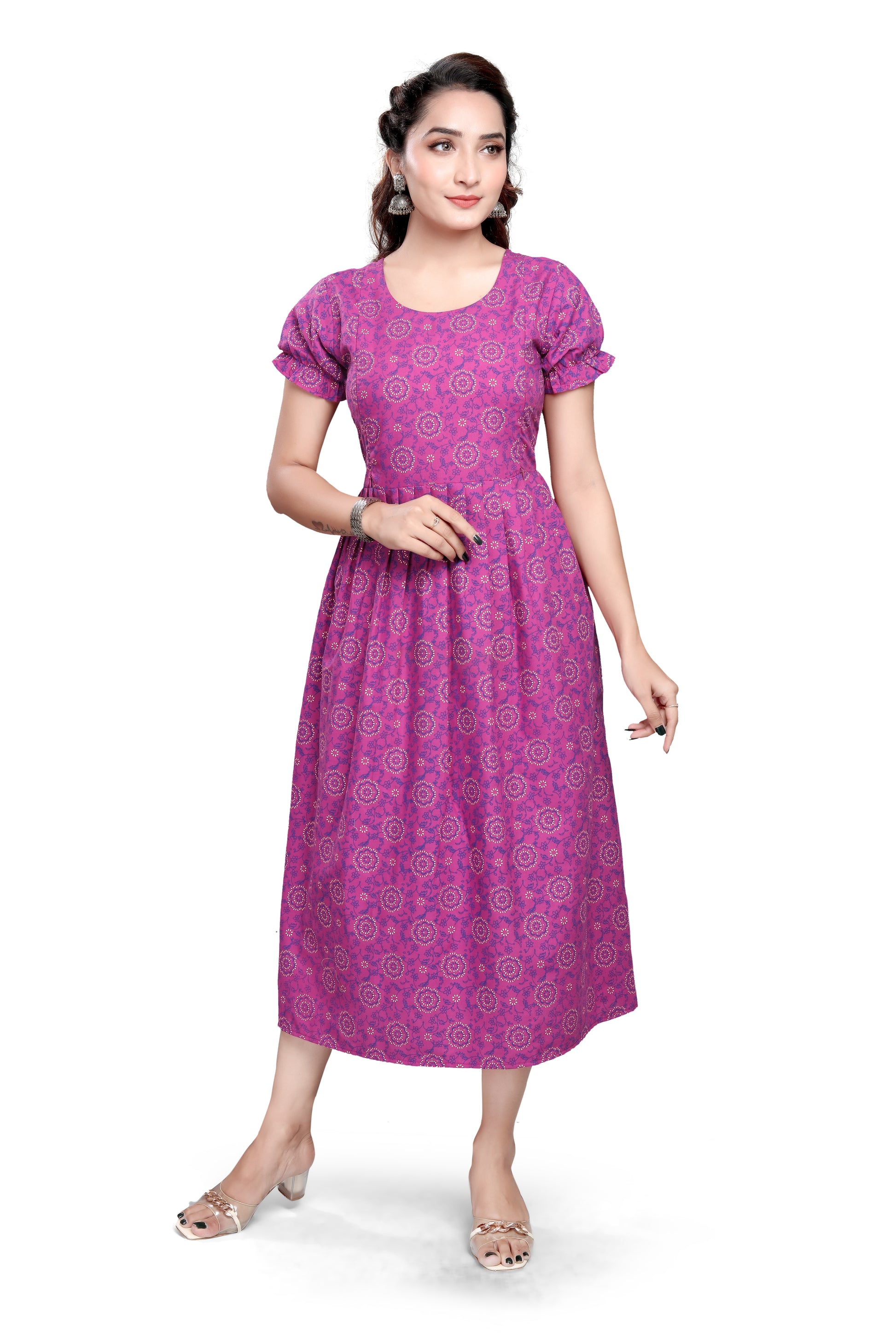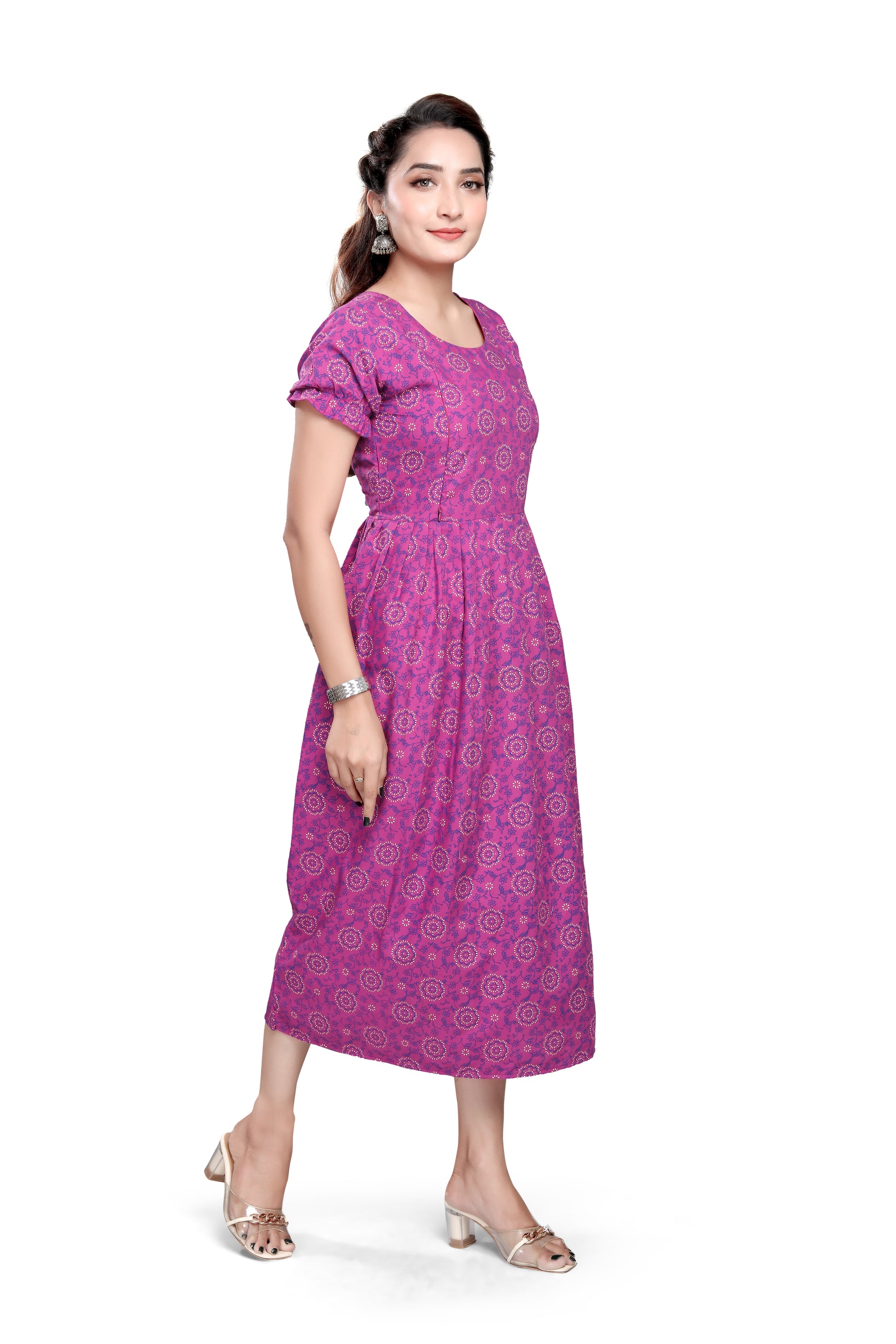 Vibrant and stylish purple cotton dress adorned with intricate mandala prints, designed for ultimate comfort and elegance. Perfect for maternity wear, casual outings, and festive occasions with its flattering fit-and-flare silhouette.