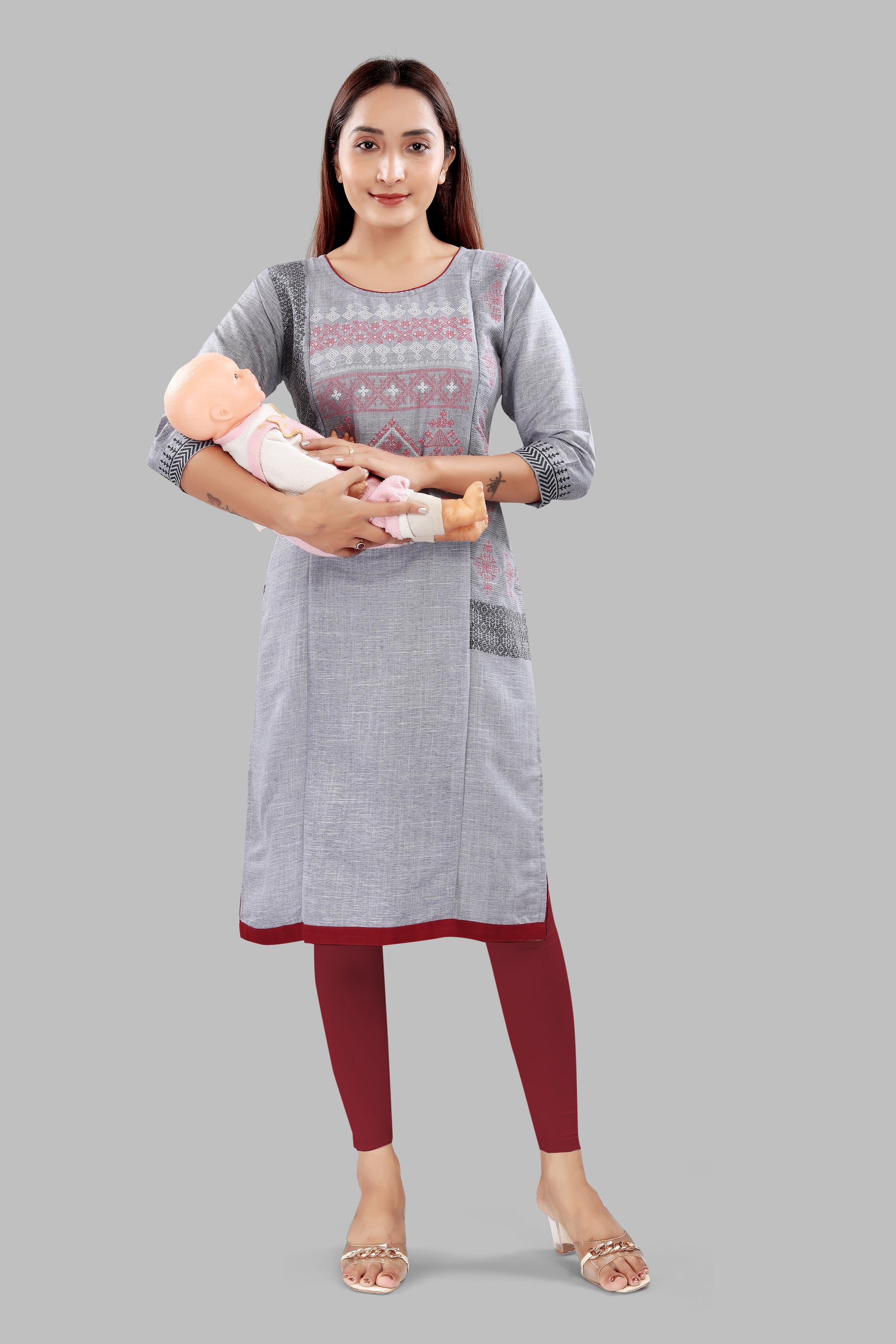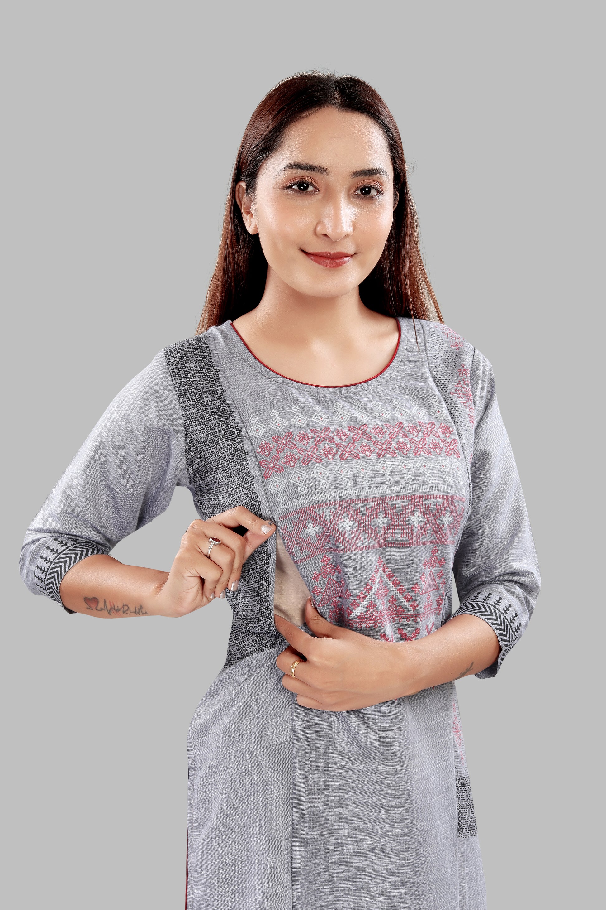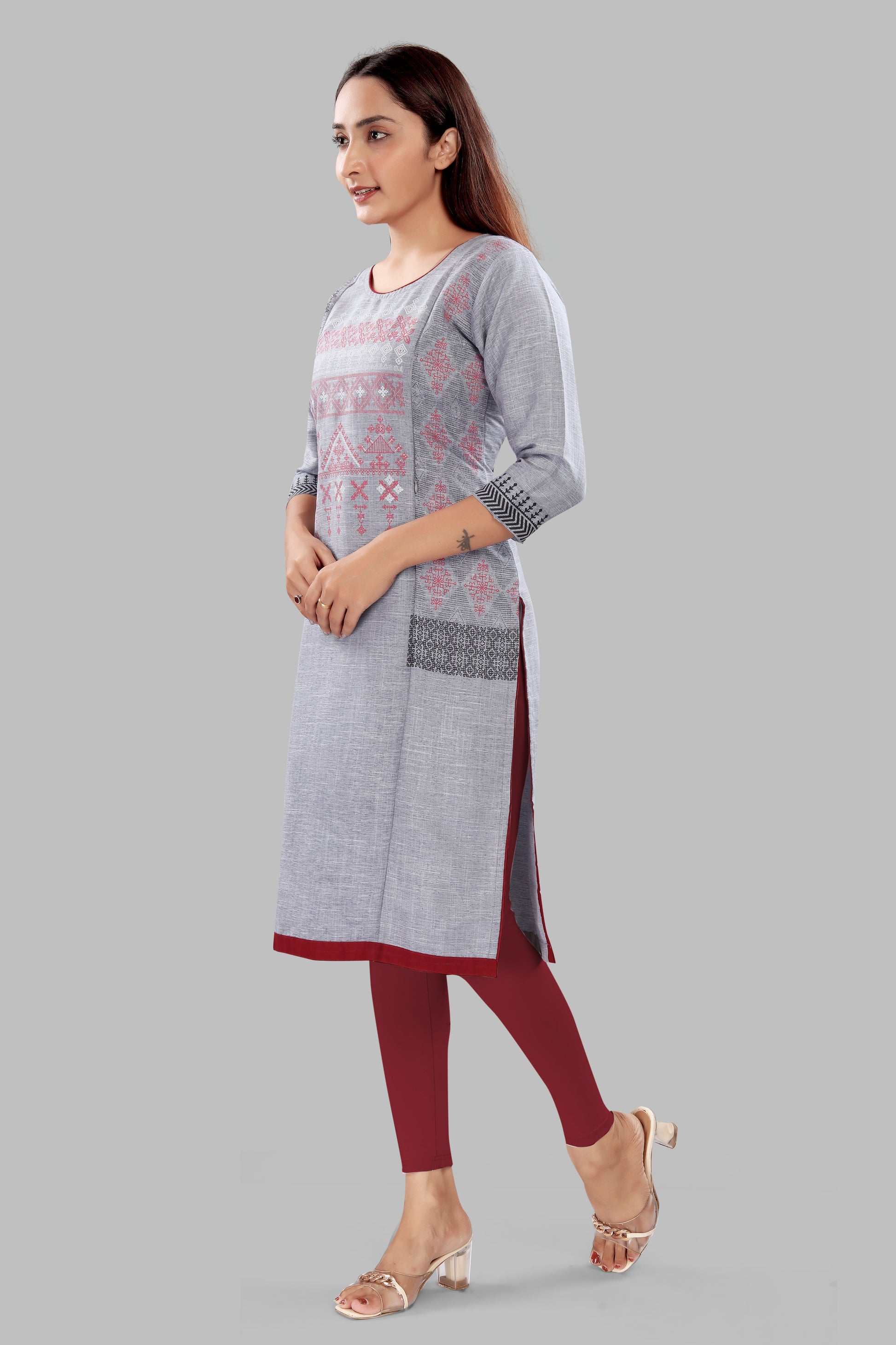 - Ash grey mélange base with pink & charcoal motifs; contrast maroon hem and inside facing.