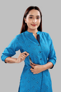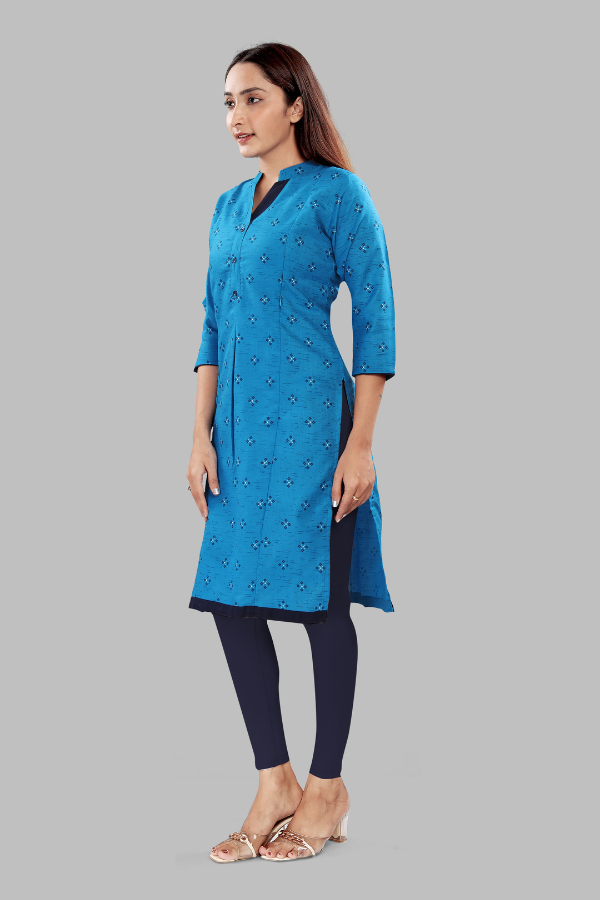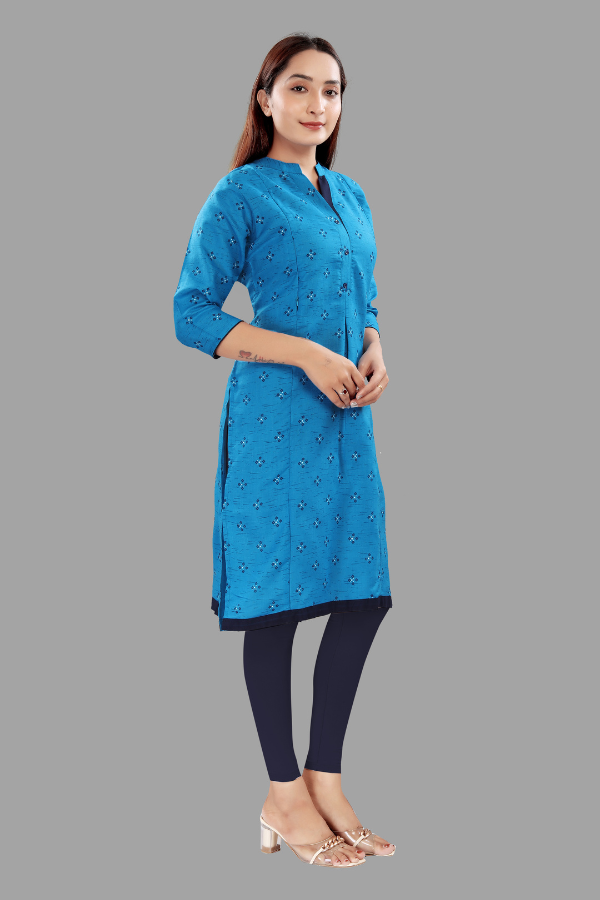- Straight silhouette with mandarin collar & 3/4 sleeves; contrast navy piping/edging at cuffs and hem.