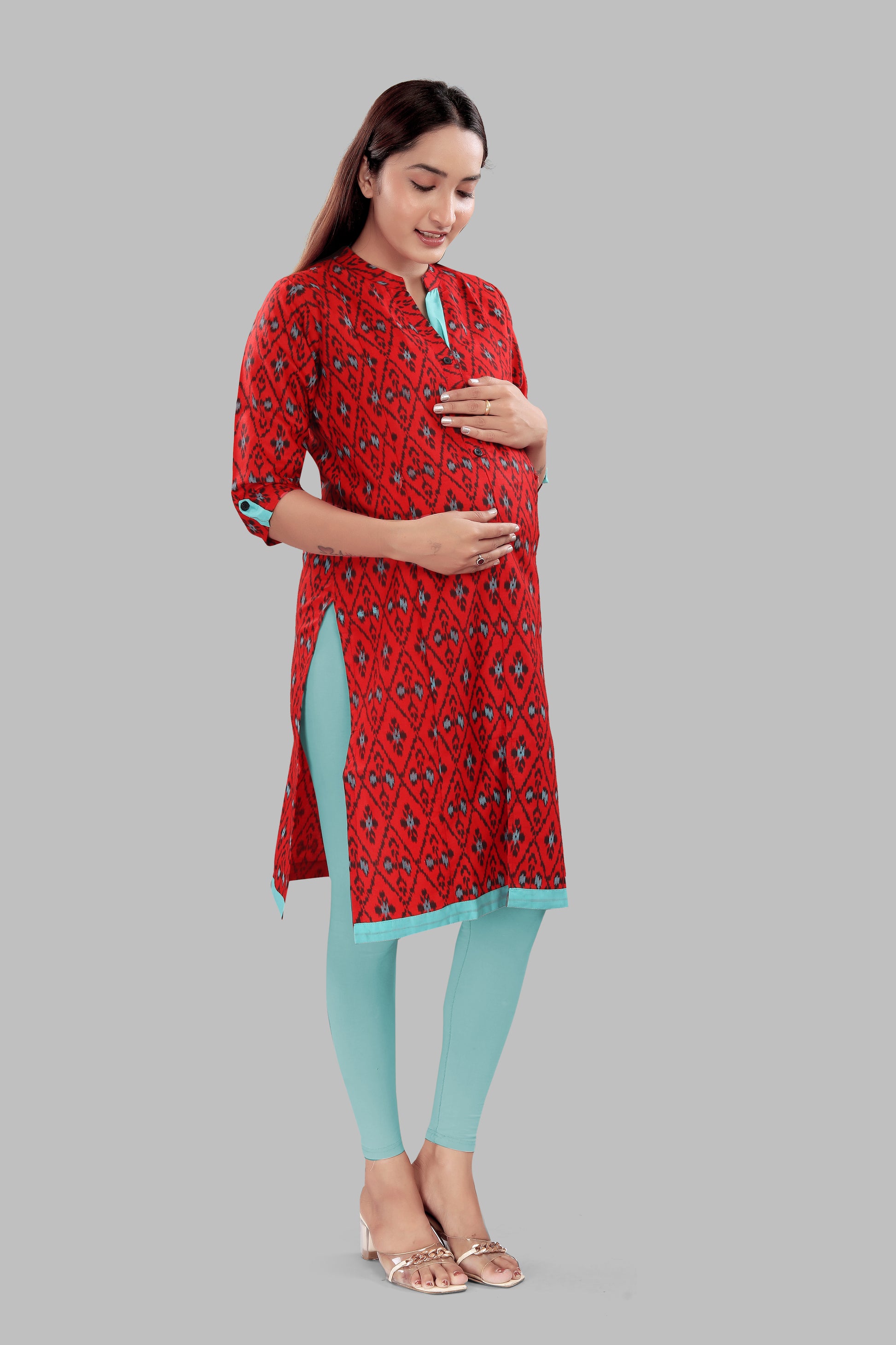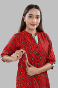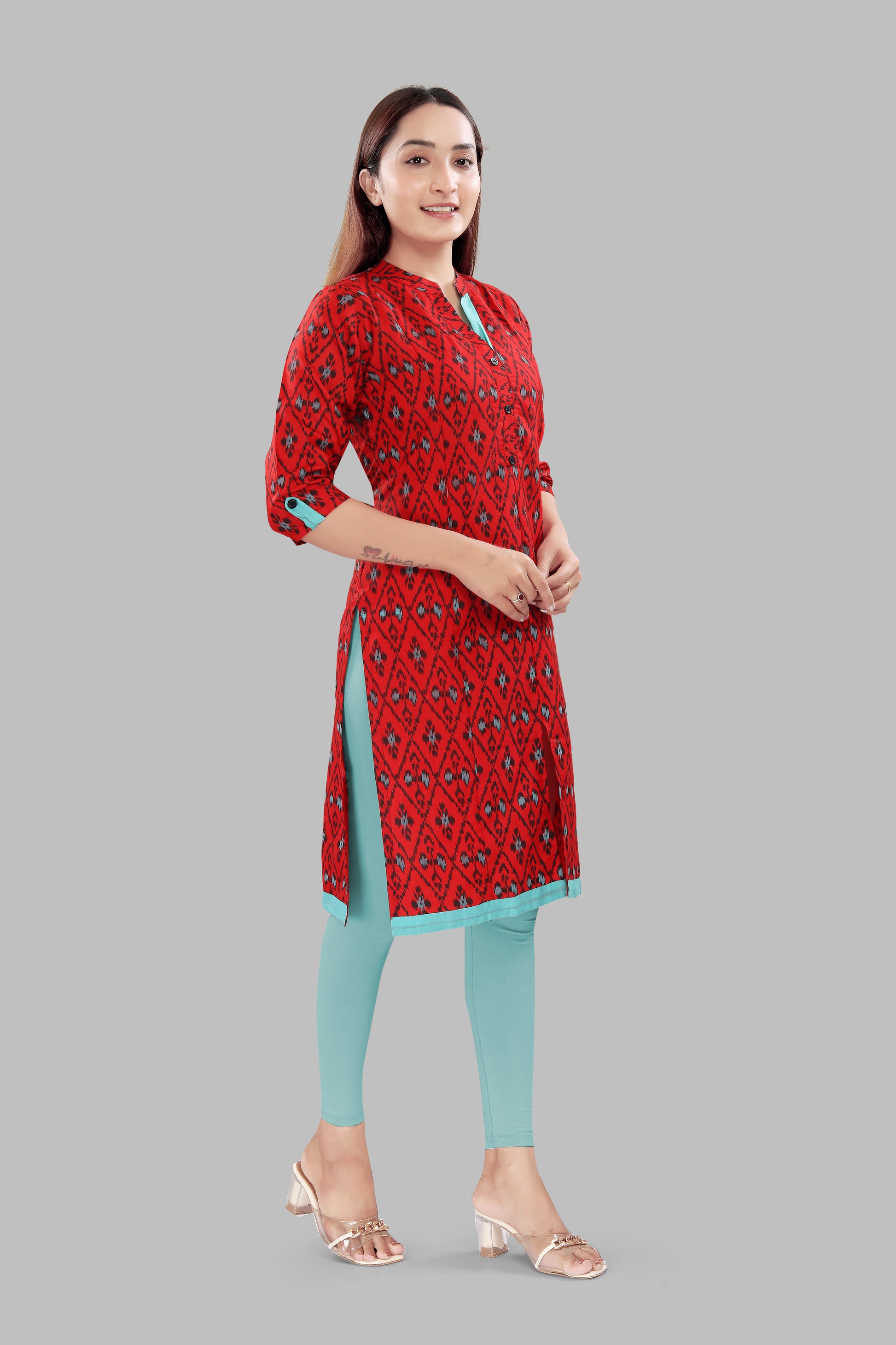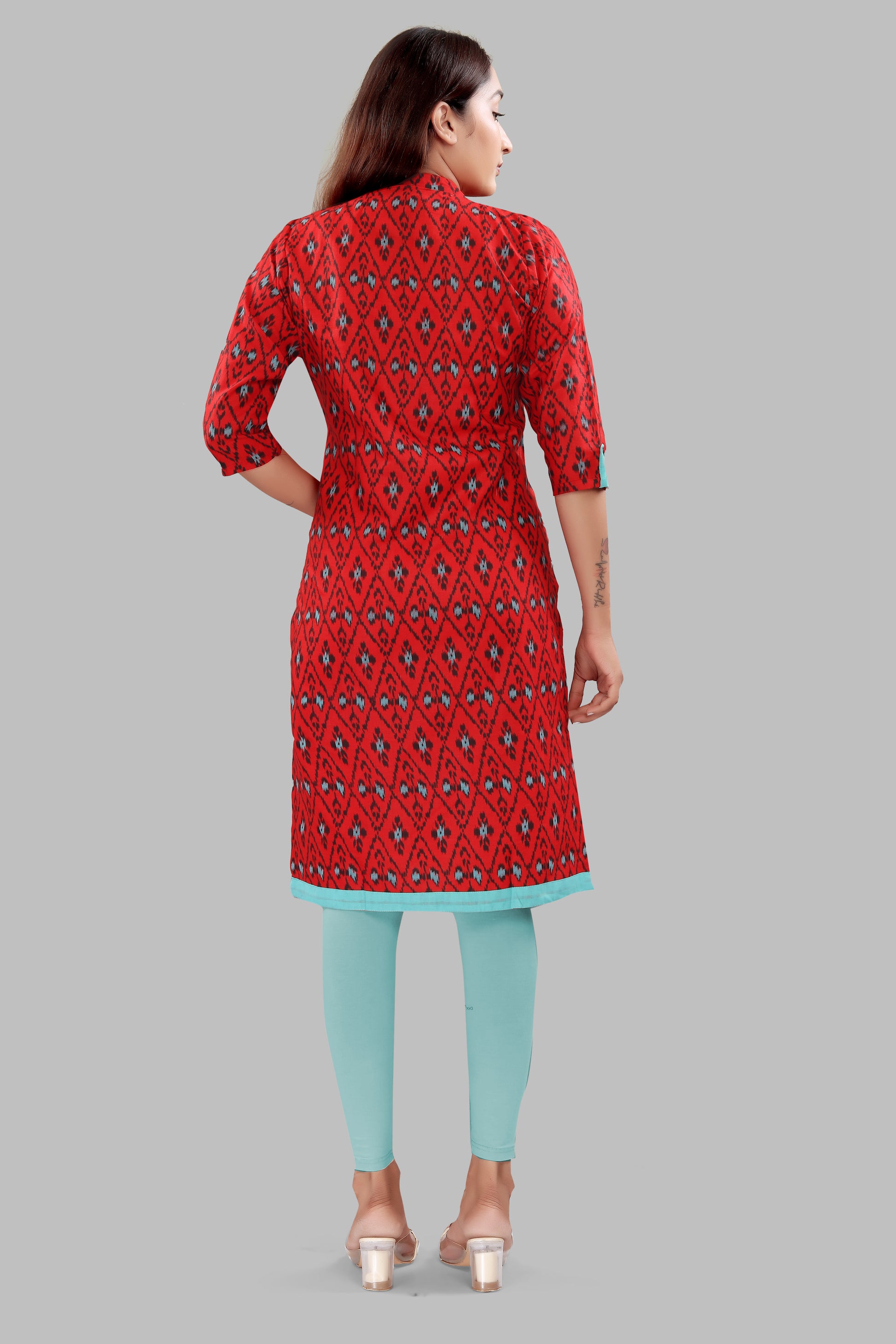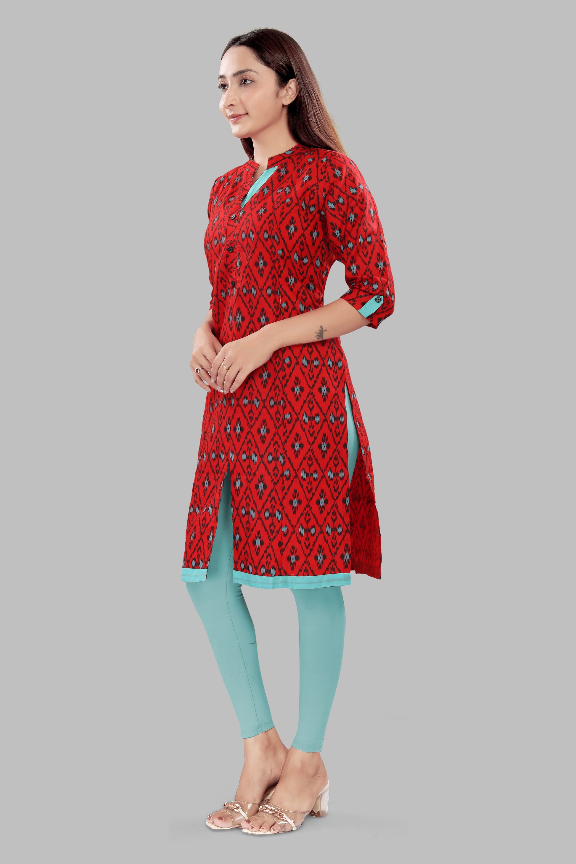 - Bold red ikat print elevated with aqua inner placket, sleeve tabs & hem piping.