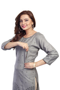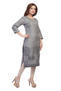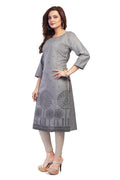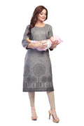- Subtle dotted butis with bold mandala-floral hem print in charcoal.