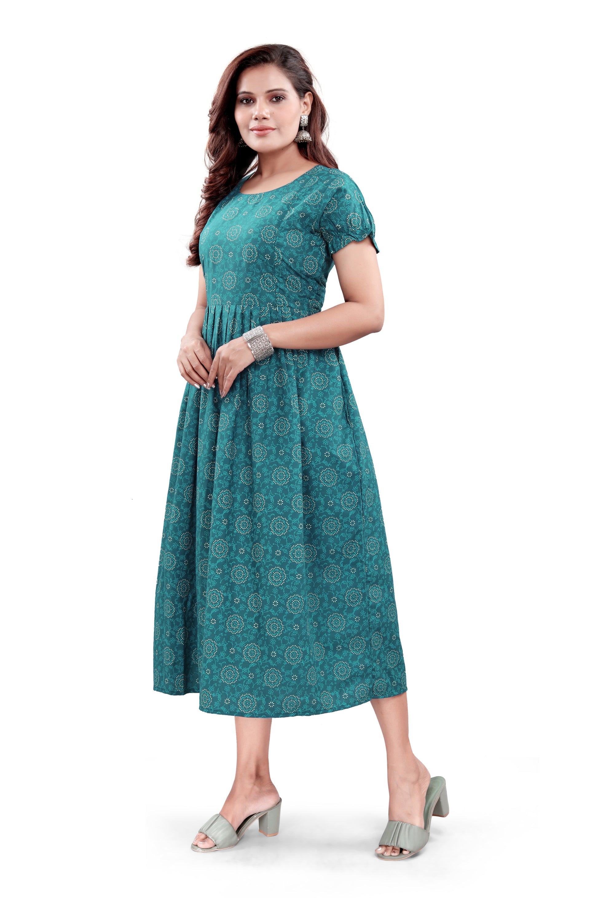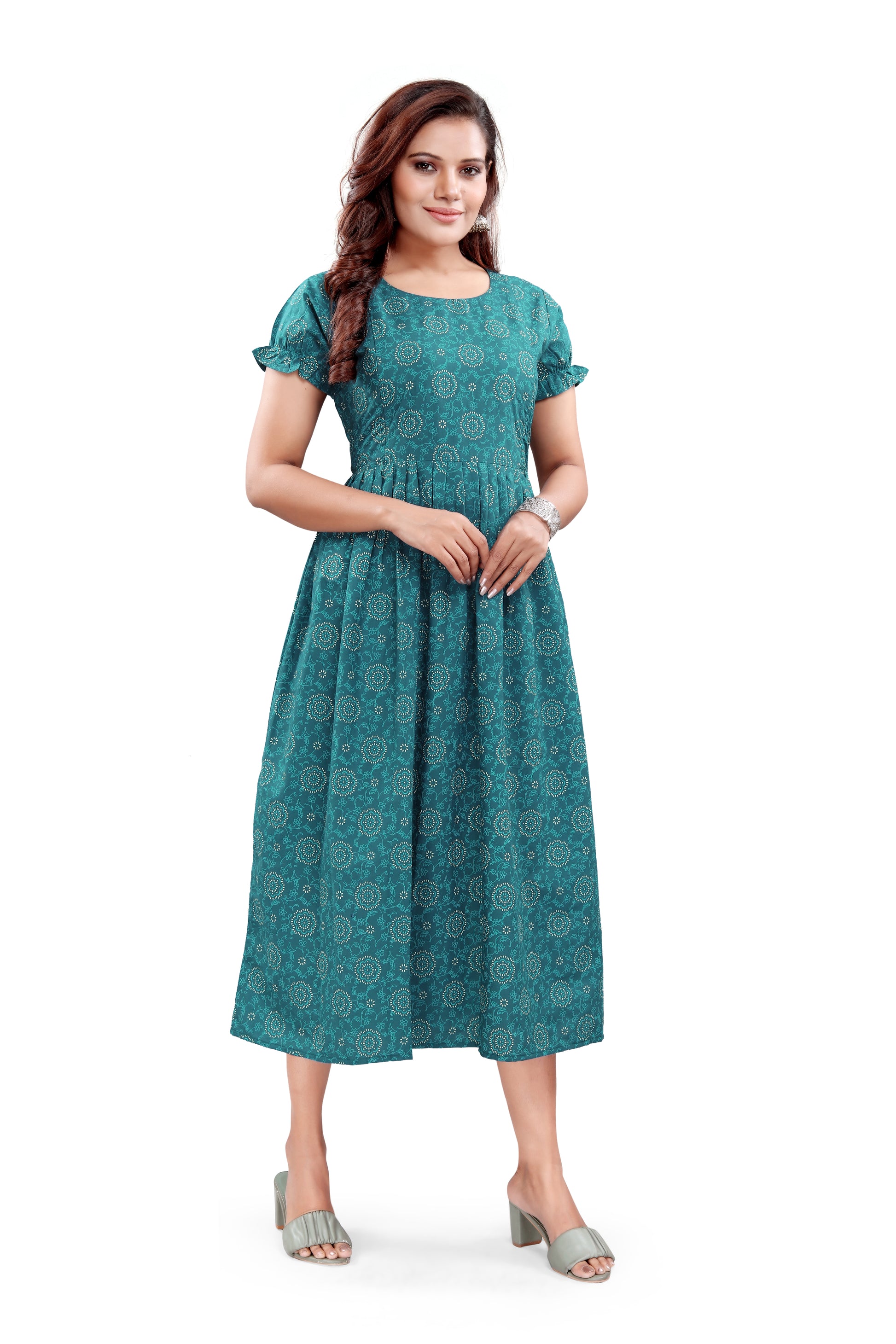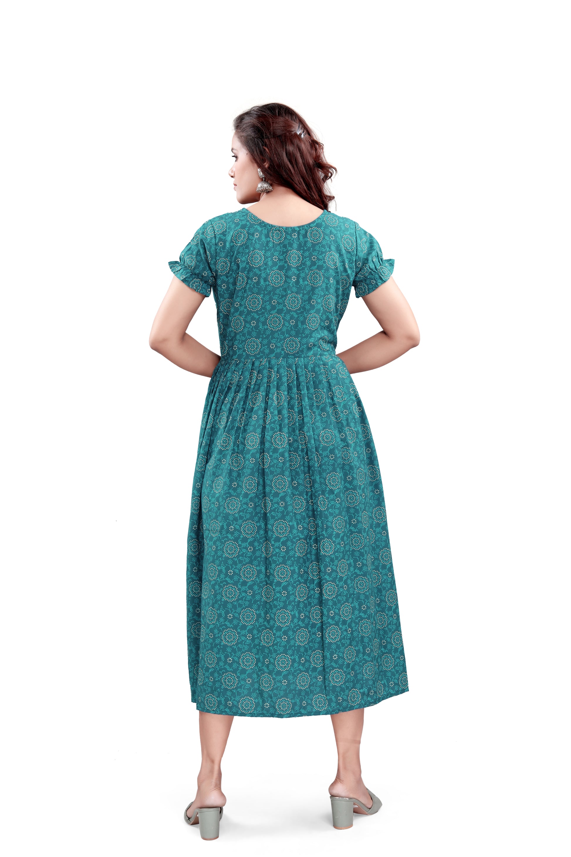 - Chic teal base with delicate mandala motifs; sweet ruffle sleeves.